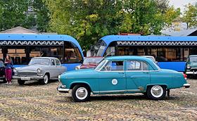 Торжественный парад трамваев, посвященный Дню города. Выставка автомобилей марки ГАЗ (Волга) на параде.
