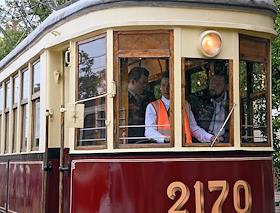 Торжественный парад трамваев, посвященный Дню города. Пассажиры в салоне исторического трамвая.