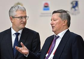 Восточный экономический форум (ВЭФ) 2023 на территории Дальневосточного федерального университета (ДВФУ) на острове Русский. Губернатор Камчатского края Владимир Солодов (слева) и специальный представитель президента России по вопросам природоохранной деятельности, экологии и транспорта Сергей Иванов (справа) перед началом заседания пленарной сессии "Сохранение и гармоничное использование хищных птиц в разных странах мира" в рамках ВЭФ-2023.