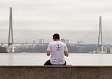 Восточный экономический форум (ВЭФ) 2023 на территории Дальневосточного федерального университета (ДВФУ) на острове Русский. Жанровая фотография. Мужчина сидит на парапете у залива. Вид на Русский мост.