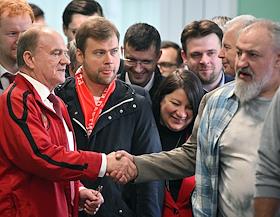 Единый день голосования (ЕДГ) 2023. Выборы мэра Москвы. Слева направо: член комитета Государственной думы (ГД) России по бюджету и налогам Денис Парфенов, лидер КПРФ, член комитета ГД России по делам Содружества Независимых Государств, евразийской интеграции и связям с соотечественниками Геннадий Зюганов и кандидат в мэры Москвы от КПРФ, депутат Московской городской думы Леонид Зюганов перед началом голосования на избирательном участке № 143 в школе № 1574.