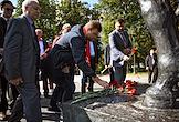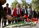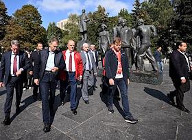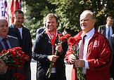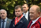 Единый день голосования (ЕДГ) 2023. Выборы мэра Москвы. Кандидат в мэры Москвы от КПРФ, депутат Московской городской думы Леонид Зюганов (в центре) во время церемонии возложения цветов к архитектурному ансамблю, посвященному писателю Александру Фадееву, на Миусской площади слева) после голосования на избирательном участке № 143 в школе № 1574.