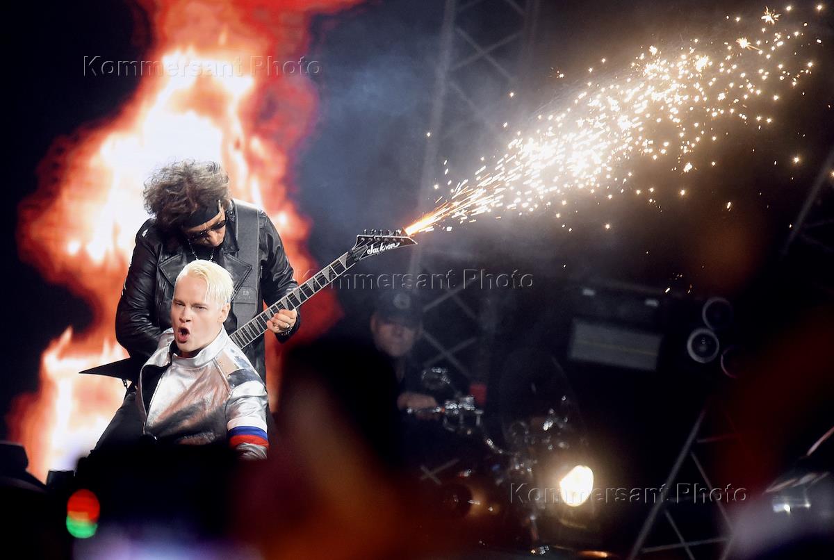 Концерт певца SHAMAN (Ярослав Дронов) на стадионе "Газпром Арена". Певец SHAMAN (слева) во время концерта.