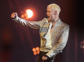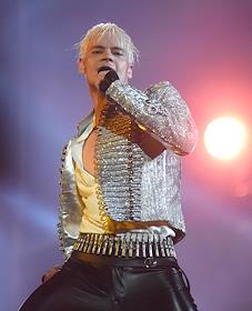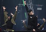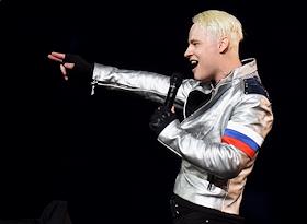 Concert of the singer SHAMAN (Yaroslav Dronov) at the Gazprom Arena stadium. Singer SHAMAN (left) during the concert.