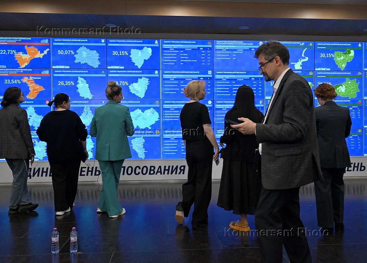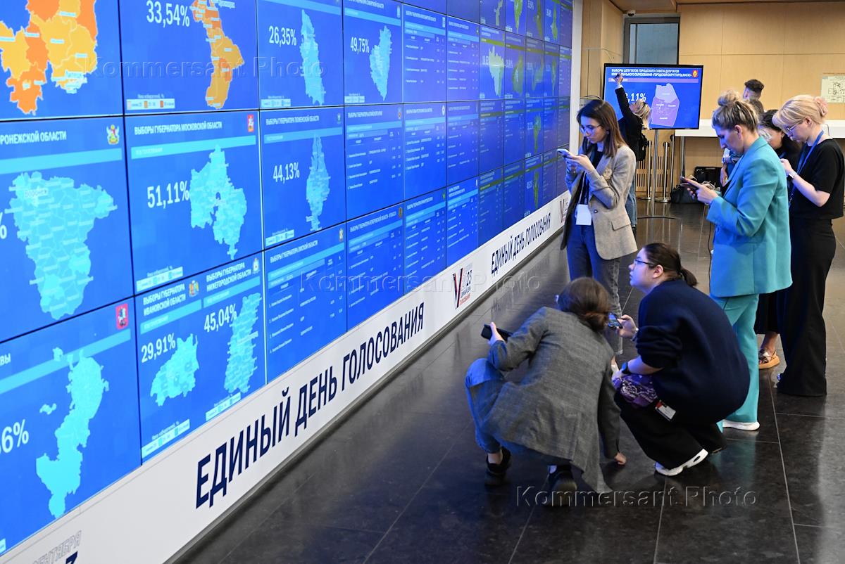 Дискуссия на тему "Попытки вмешательства в выборы: внешние угрозы и информационная безопасность" в МИА "Россия сегодня". Жанровая фотография. Экраны с показателем процента проголосовавших в разных регионах страны.