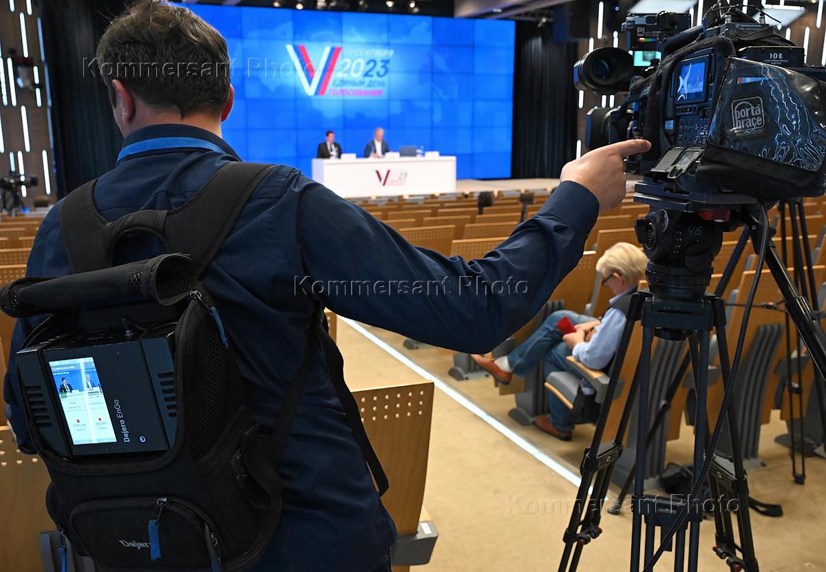 Единый день голосования (ЕДГ) 2023. Трансляция выступления заместителя председателя Центральной Избирательной Комиссии (ЦИК) России Николая Булаева (на экране) в МИА "Россия сегодня".
