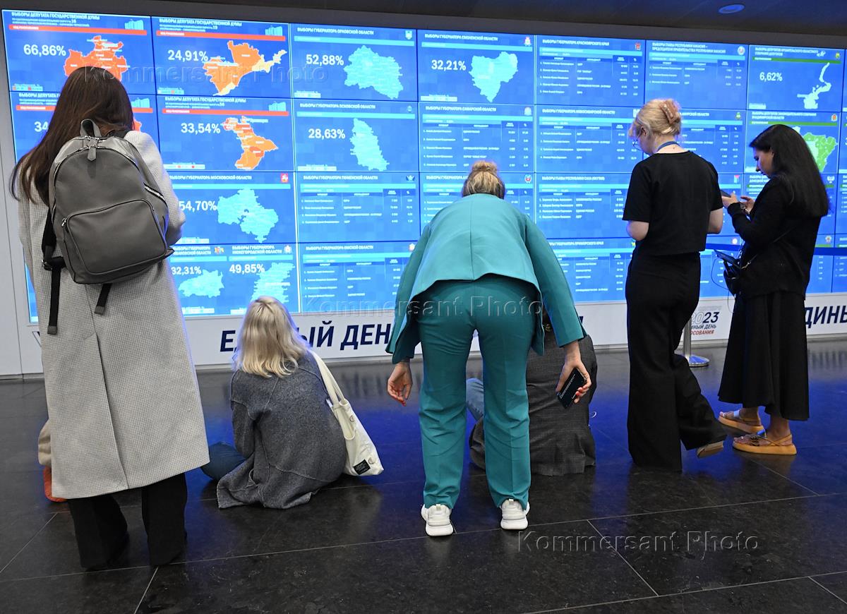 Дискуссия на тему "Попытки вмешательства в выборы: внешние угрозы и информационная безопасность" в МИА "Россия сегодня". Жанровая фотография. Экраны с показателем процента проголосовавших в разных регионах страны.
