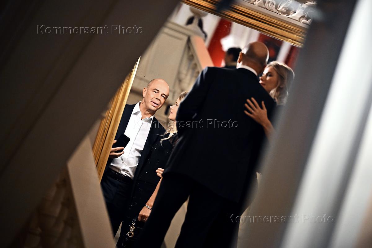 Премьера балета "Лазги. Танец души и любви" Национального балета Узбекистана на Исторической сцене Государственного академического Большого театра (ГАБТ). Бизнесмен Алимжан Тохтахунов (слева), постановщик балетных спектаклей Андрис Лиепа (второй справа) и балерина Илзе Лиепа (справа) перед началом спектакля.