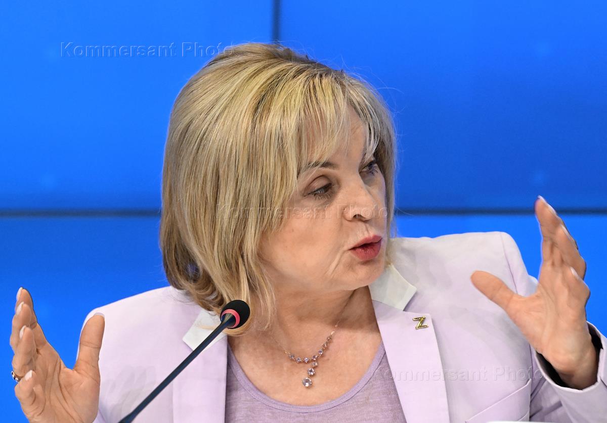 Chairman of the Central Election Commission (CEC) of Russia Ella Pamfilova (center) during a briefing on the preliminary results of voting in the elections on the Single Voting Day (SVD)-2023 at the Rossiya Segodnya news agency.