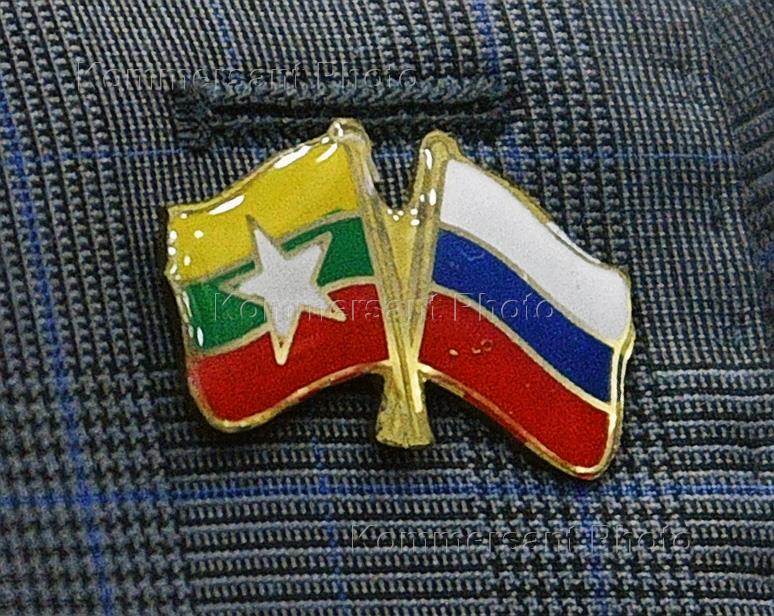 Eastern Economic Forum (EEF) 2023 on the territory of the Far Eastern Federal University (FEFU) on Russky Island. Genre photography. A badge depicting the state flags of Russia and the Republic of the Union of Myanmar on the lapel of a forum participant’s jacket.