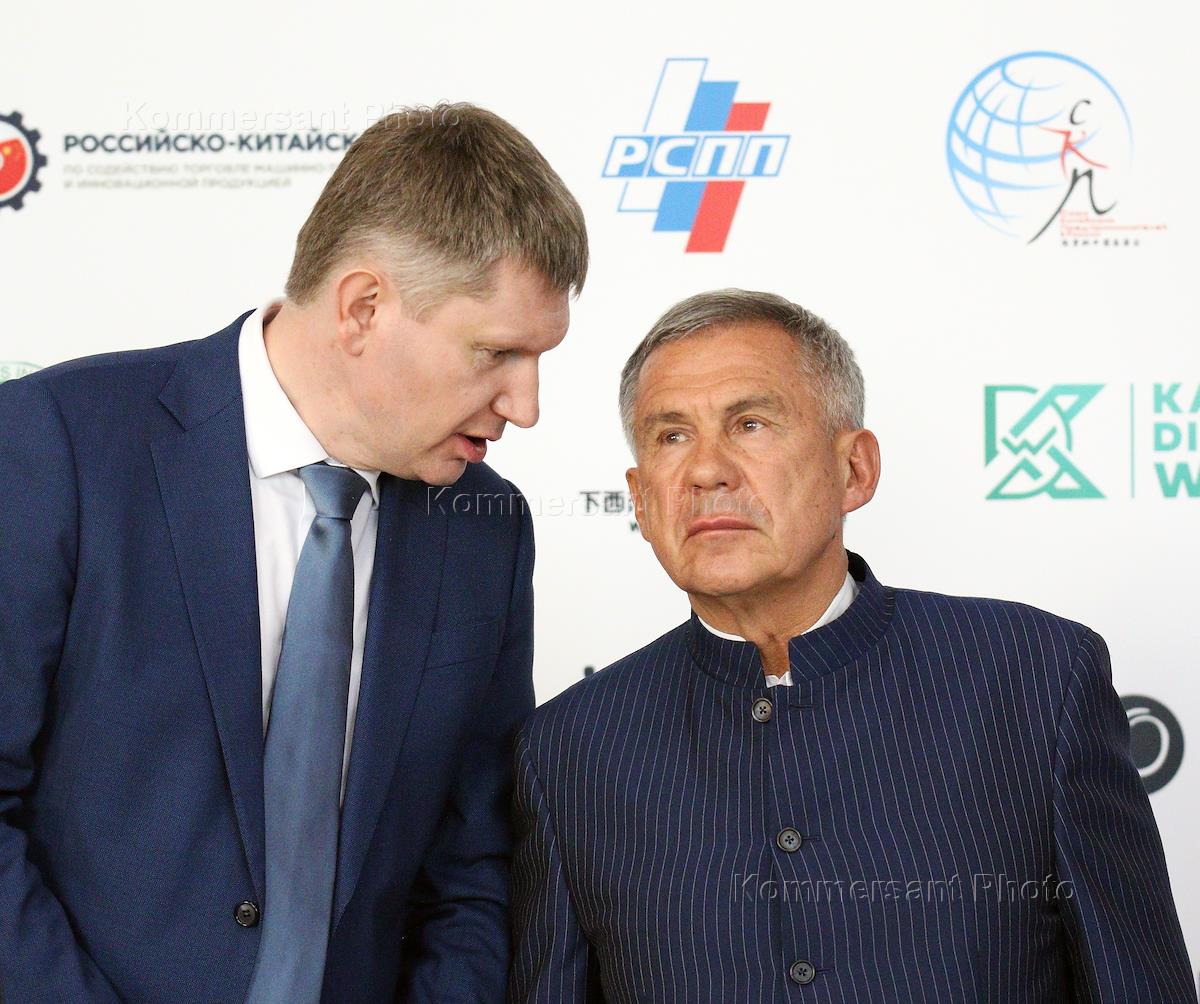 Первый международный форум "Ростки: Россия и Китай — взаимовыгодное сотрудничество" в Международном выставочном центре (МВЦ) "Казань Экспо". Министр экономического развития РФ Максим Решетников (слева) и глава Республики Татарстан Рустам Минниханов (справа) во время общения с прессой после пленарного заседания "Россия – Китай: экономическое сближение, крупные проекты, инфраструктурные перспективы".