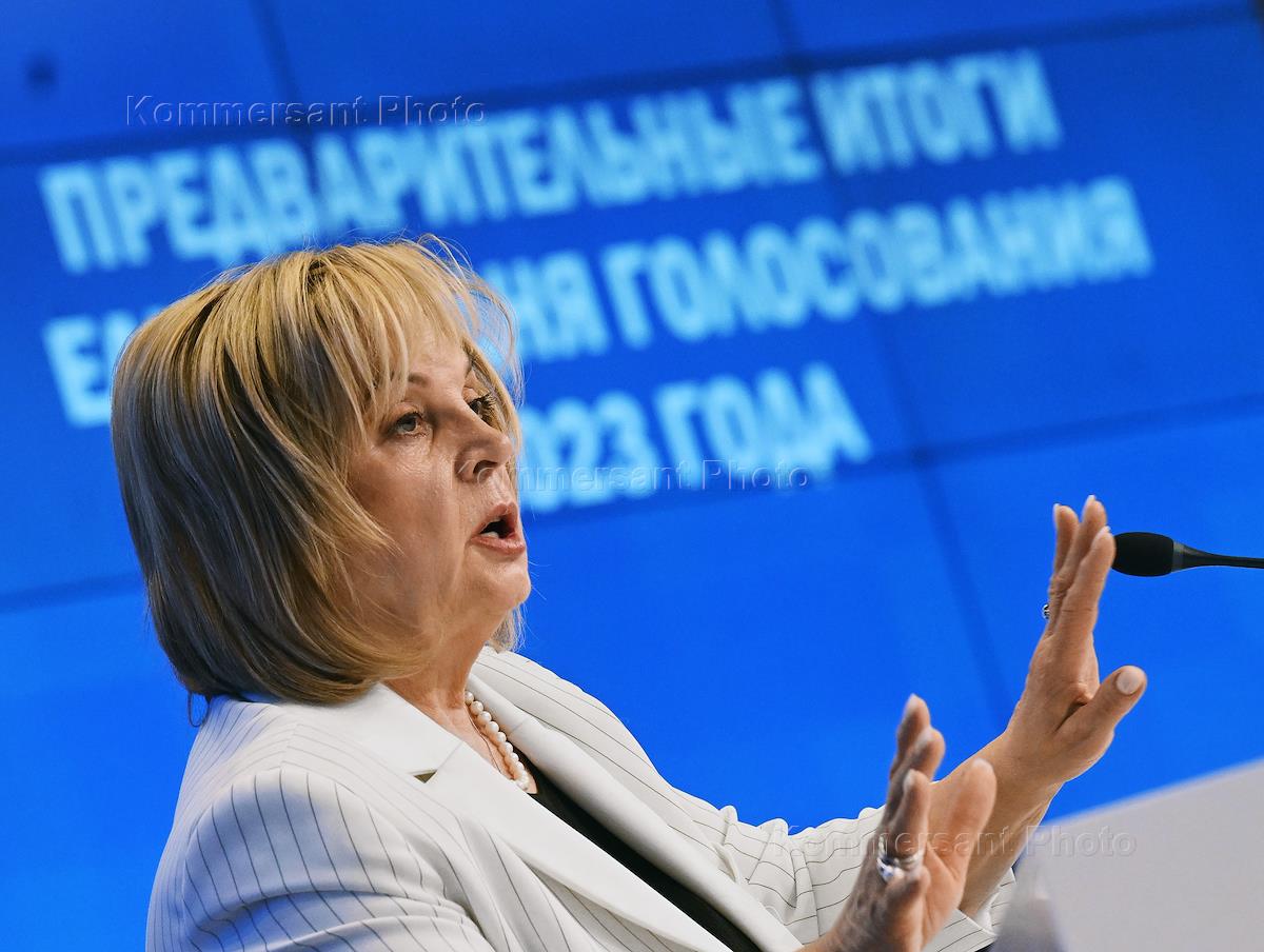 Брифинг председателя Центральной избирательной комиссии (ЦИК) России Эллы Памфиловой о предварительных итогах Единого дня голосования (ЕДГ-2023) в МИА "Россия сегодня". Жанровая фотография.