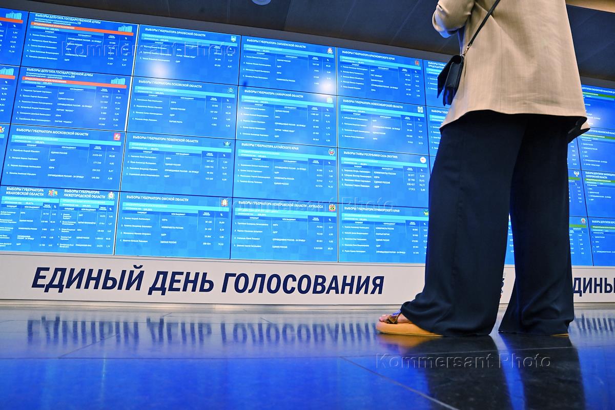Единый день голосования (ЕДГ-2023). Завершение работы Информационного центра Центральной избирательной комиссии (ЦИК) России в МИА "Россия сегодня". Жанровая фотография.