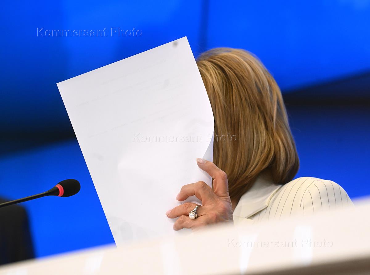 Брифинг председателя Центральной избирательной комиссии (ЦИК) России Эллы Памфиловой о предварительных итогах Единого дня голосования (ЕДГ-2023) в МИА "Россия сегодня". Жанровая фотография.