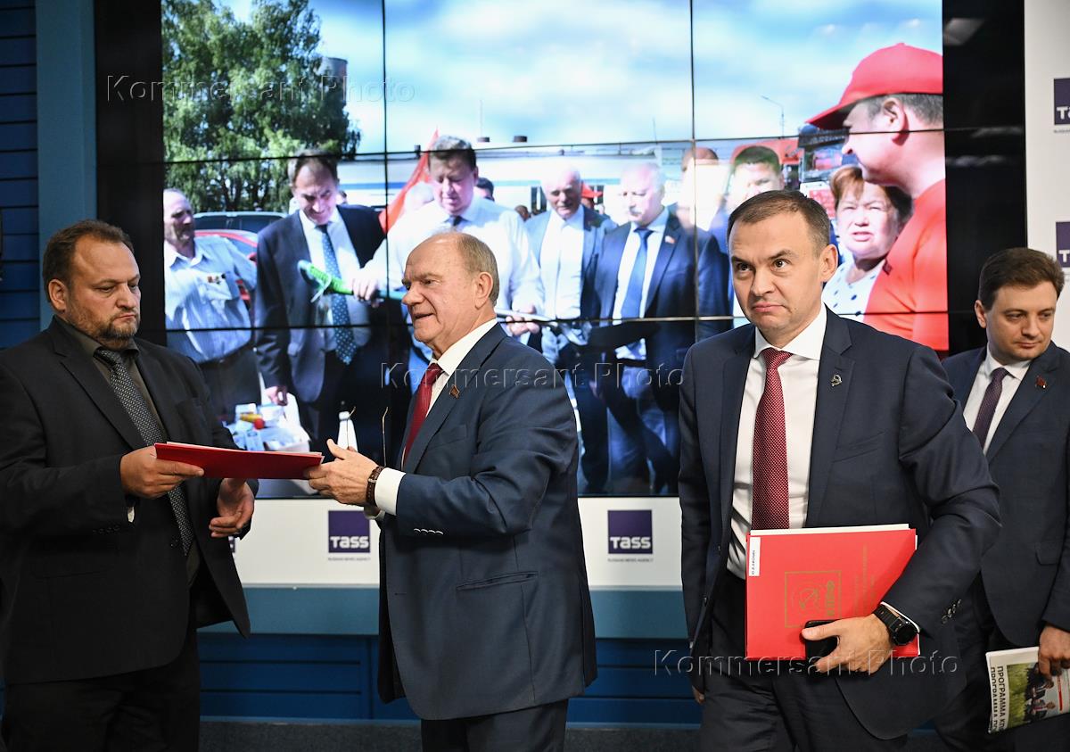 Брифинг КПРФ по итогам Единого дня голосования в пресс-центре ТАСС. Справа налево: заместитель председателя комитета Государственной думы (ГД) России Георгий Камнев, первый заместитель председателя ЦК КПРФ Юрий Афонин и лидер КПРФ, член комитета ГД по делам Содружества Независимых Государств, евразийской интеграции и связям с соотечественниками Геннадий Зюганов во время брифинга.