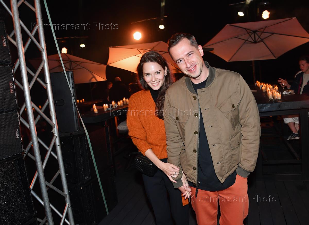 Online cinema festival "New Season 2023" at the Rosa Khutor mountain resort. Fourth day. A party organized by the Kinopoisk platform at the Chukotka gastro-bar. Actor Maxim Matveev (right) and actress Victoria Maslova (center) at a party.