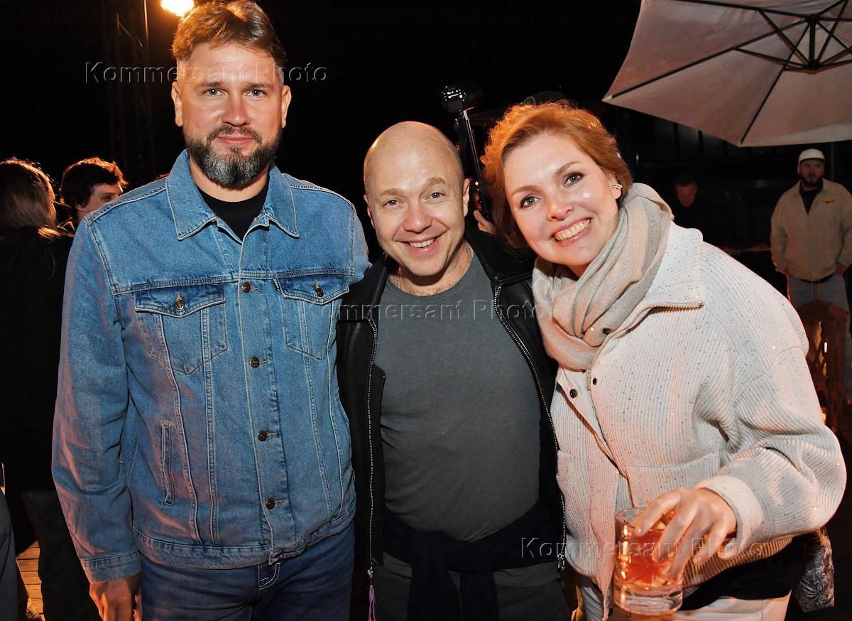 Фестиваль онлайн-кинотеатров "Новый сезон-2023" на горном курорте "Роза Хутор". Четвертый день. Вечеринка, организованная платформой "Кинопоиск", в гастро-баре "Чукотка". Актер Максим Матвеев (справа) и актриса Виктория Маслова (в центре) на вечеринке.