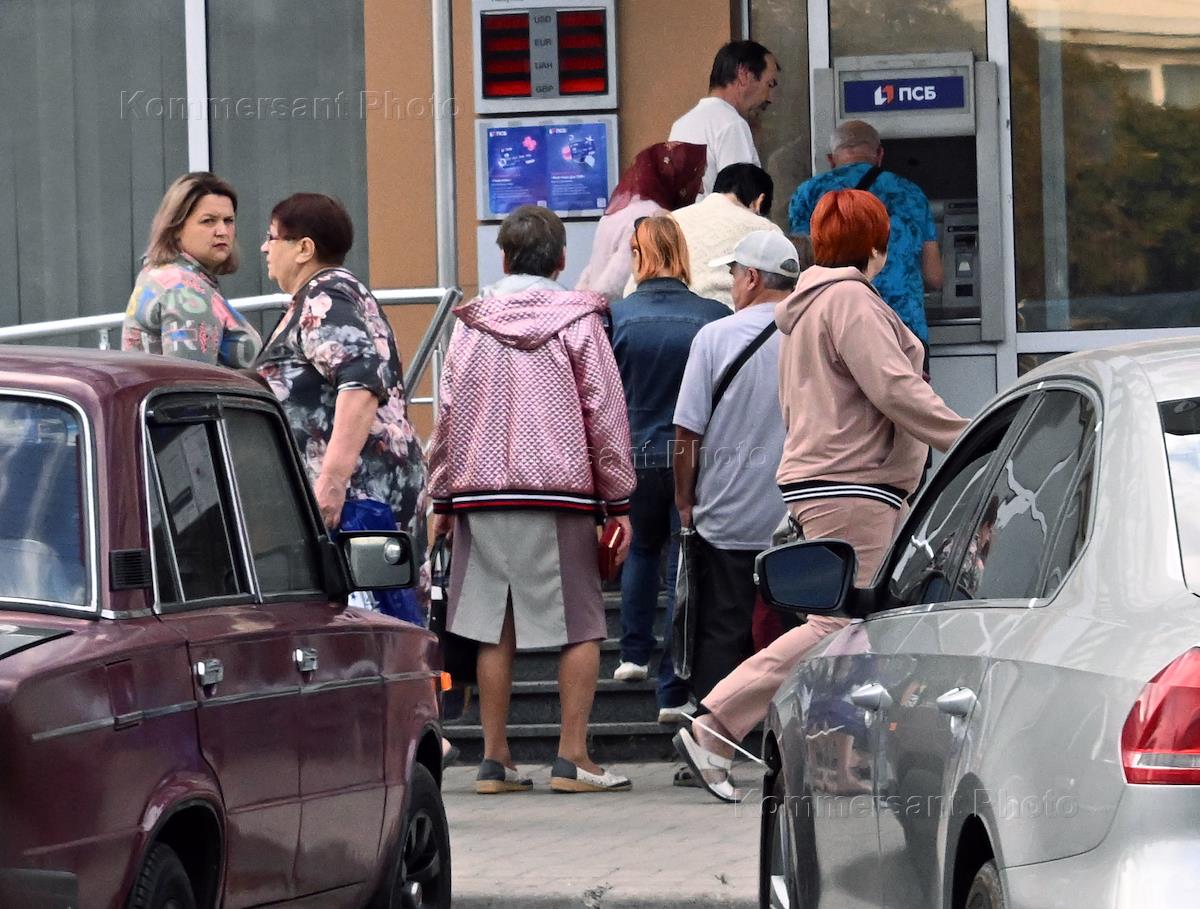 Views of Makeevka. Genre photography. Queue at the Promsvyazbank ATM.