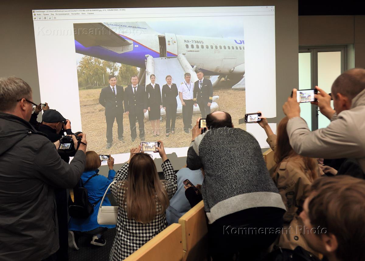 Media representatives during a briefing by Sergei Skuratov, CEO of Ural Airlines OJSC.