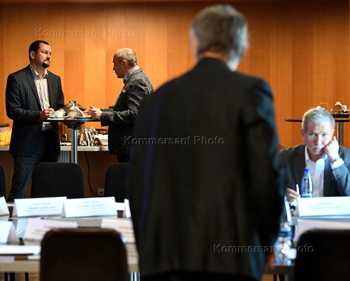Meeting of the "Region" club on the topic "Elections 2023: national trends and regional specifics" at the "Standart" design hotel. CEO of the Agency for Political and Economic Communications Dmitry Orlov (center) and manager of the Institute of Political Research, political scientist Sergei Markov (right) before the meeting.