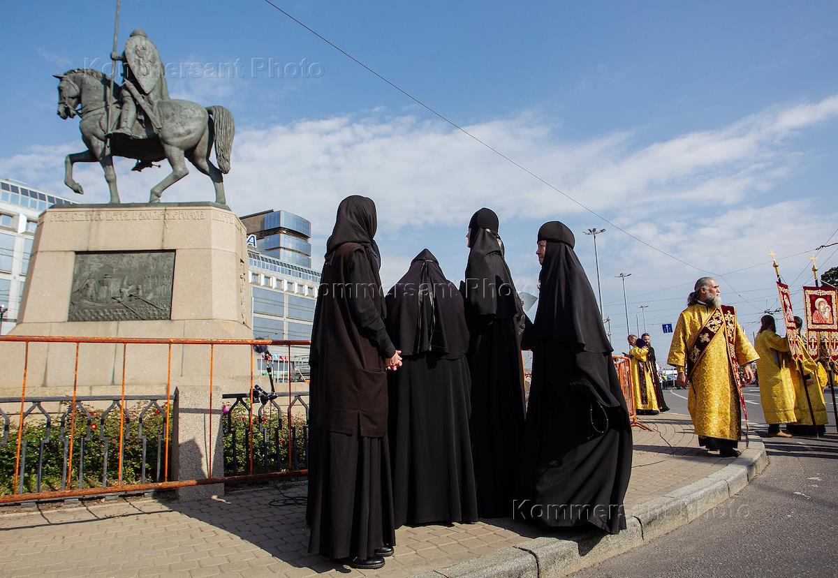 Крестный ход по Невскому проспекту от Казанского кафедрального собора к Александро-Невской лавре в День перенесения мощей святого благоверного князя Александра Невского в Санкт-Петербург. Участник крестного хода у памятника Александру Невскому.