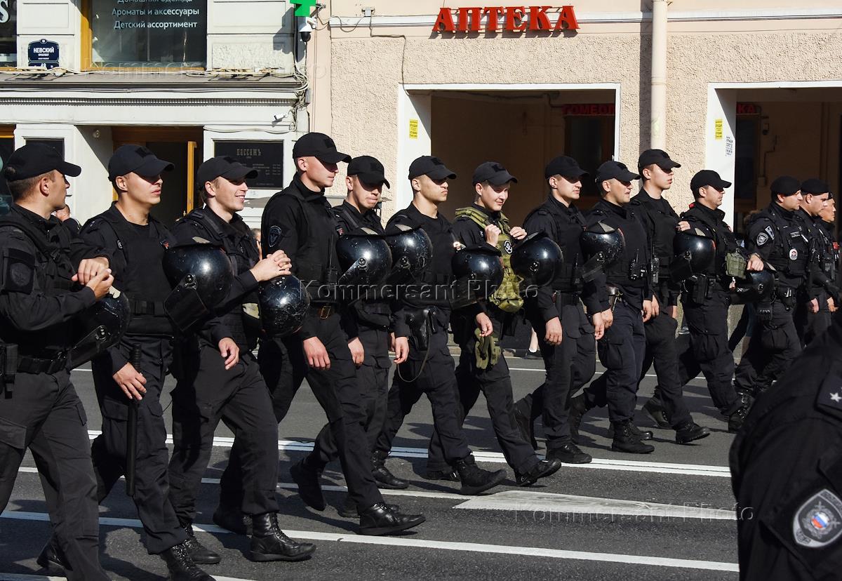 Крестный ход по Невскому проспекту от Казанского кафедрального собора к Александро-Невской лавре в День перенесения мощей святого благоверного князя Александра Невского в Санкт-Петербург. Жанровая фотография. Сотрудники полиции во время крестного хода.