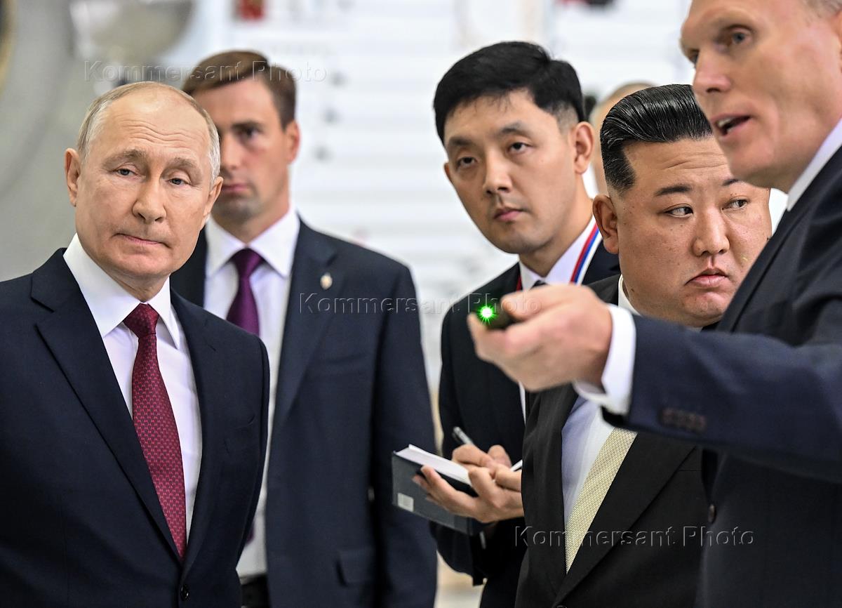 Рабочая поездка президента России Владимира Путина в Амурскую область. Встреча президента России Владимира Путина и председателя Государственного совета КНДР Ким Чен Ына. Президент России Владимир Путин (слева), председатель Государственного совета КНДР Ким Чен Ын (второй справа) и генеральный директор "Центра эксплуатации наземной космической инфраструктуры" (ЦЭНКИ) Николай Нестечук (справа) во время осмотра территории космодрома "Восточный".