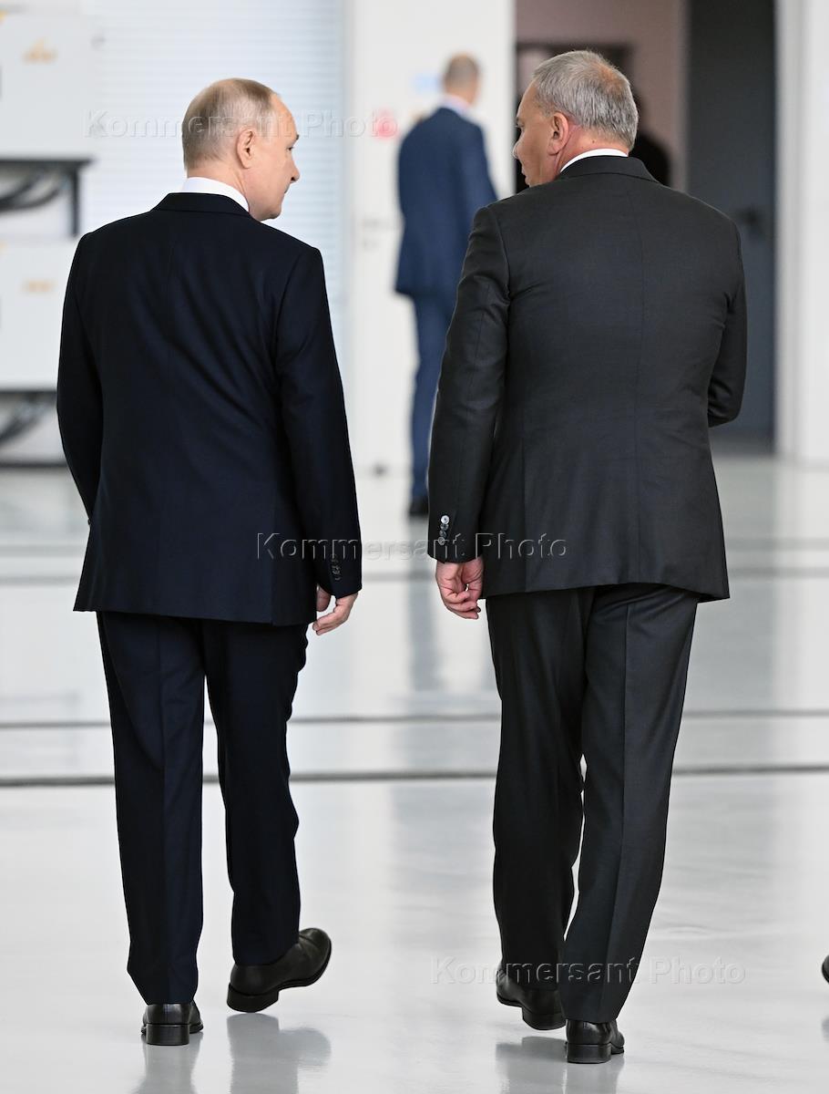 Working trip of Russian President Vladimir Putin to the Amur region. Meeting between Russian President Vladimir Putin and Chairman of the State Council of the DPRK Kim Jong-un. CEO of the state corporation for space activities "Roscosmos" Yuri Borisov (right) and Russian President Vladimir Putin (left) during an inspection of the territory of the Vostochny cosmodrome.
