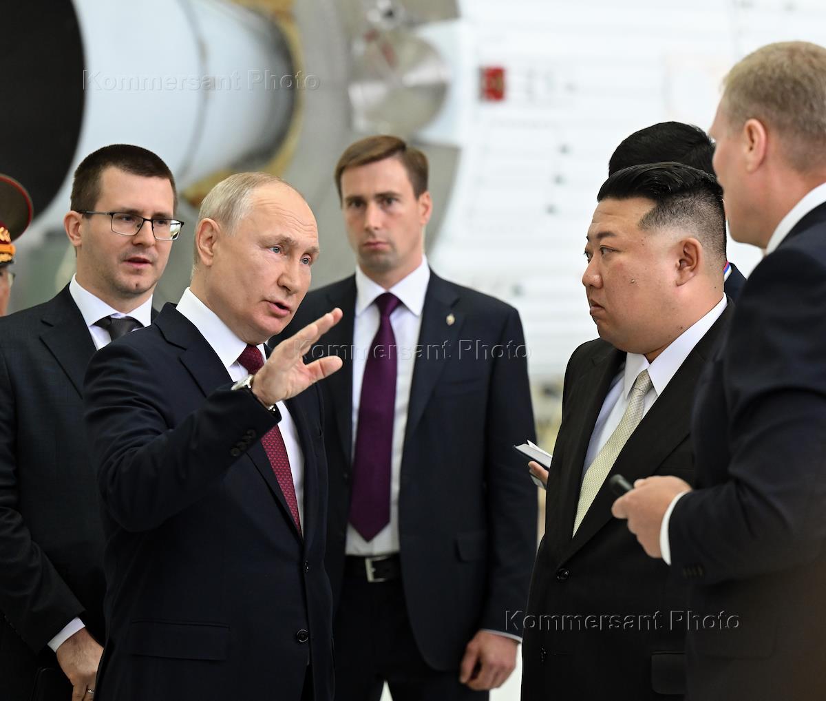 Working trip of Russian President Vladimir Putin to the Amur region. Meeting between Russian President Vladimir Putin and Chairman of the State Council of the DPRK Kim Jong-un. Russian President Vladimir Putin (second from left), Chairman of the State Council of the DPRK Kim Jong-un (third from right), CEO of the Center for Operation of Ground-Based Space Infrastructure Nikolai Nestechuk (center) and CEO of the state corporation for space activities Roscosmos Yury Borisov (left) during an inspection of the territory of the Vostochny cosmodrome.