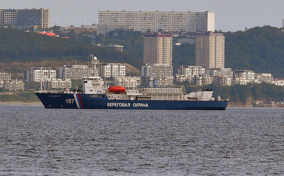 Views of Vladivostok. Genre photography. The Coast Guard ship is off the coast of the city.