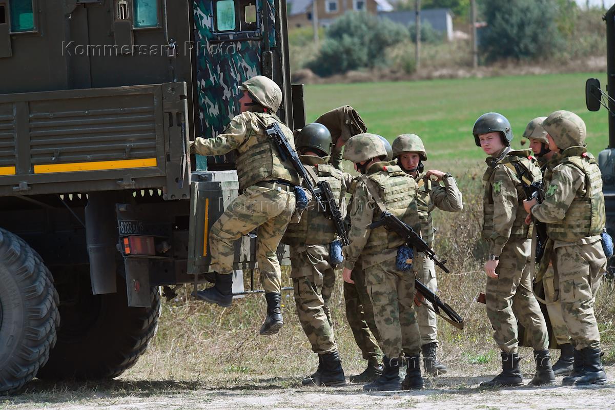 Cossack battalion "Tavrida" as part of the Russian Guard. Battalion combat coordination exercises at the training ground. Genre photography. Battalion soldiers boarding a truck after an exercise.