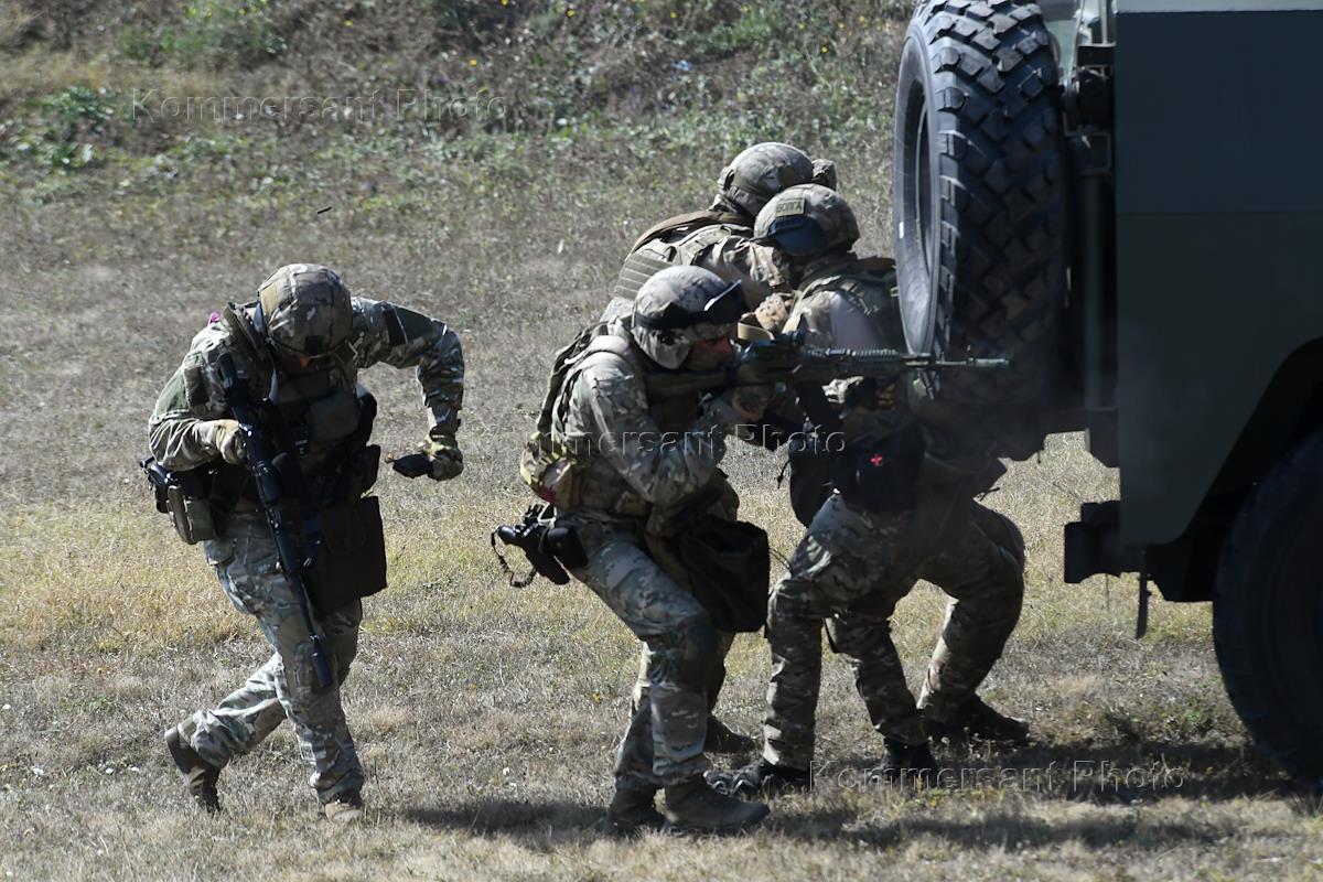 Cossack battalion "Tavrida" as part of the Russian Guard. Battalion combat coordination exercises at the training ground. Genre photography. Shooting during exercises.