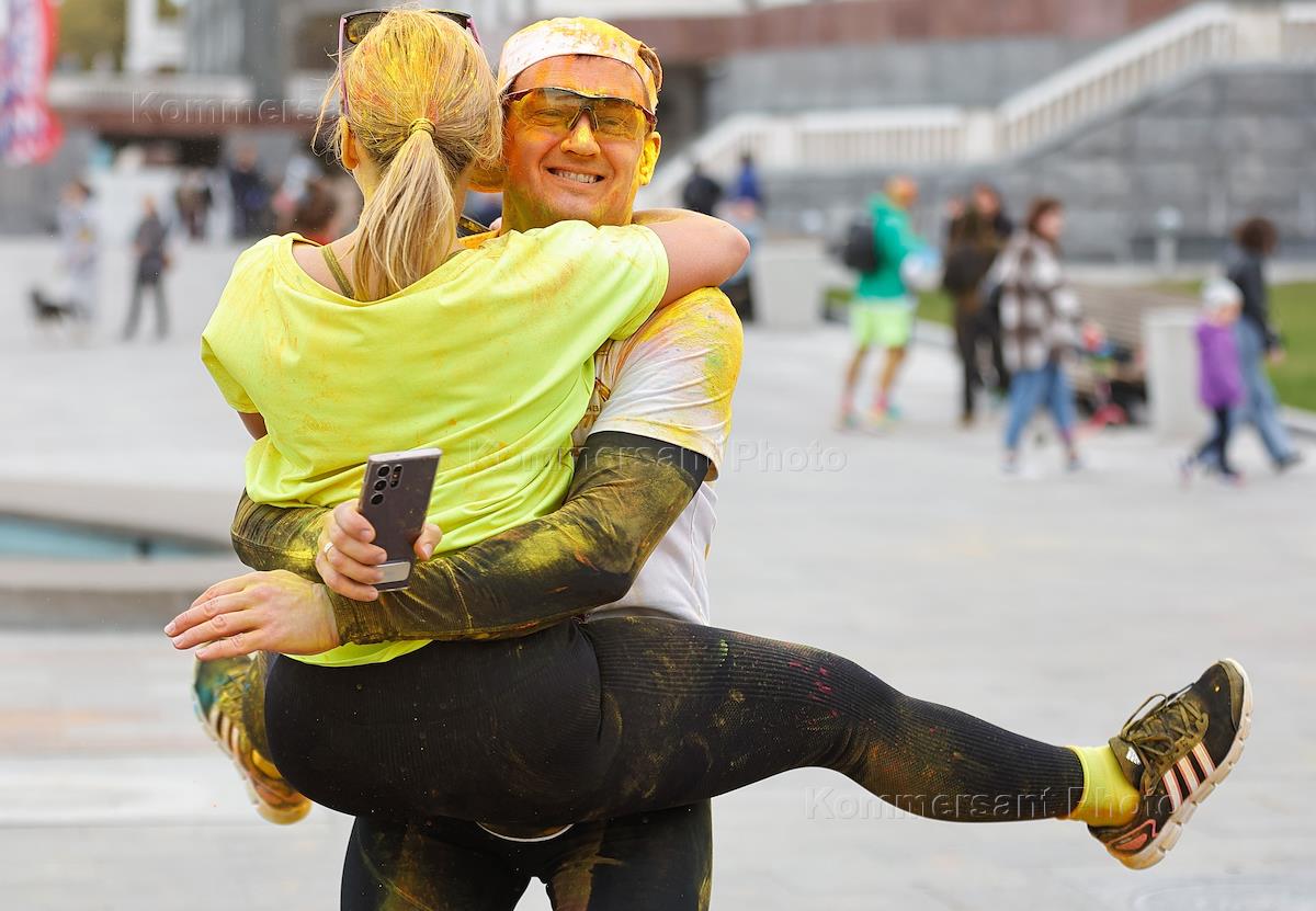 Красочный забег вдоль набережной на Северном речном вокзале в рамках празднования Дня города. Участники на финише.
