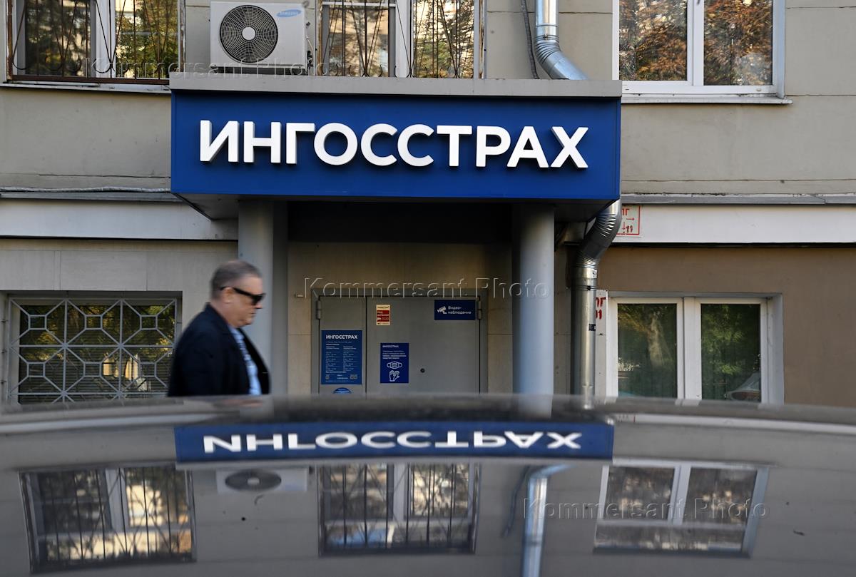Genre photography. Signboard of the Russian insurance company "Ingosstrakh" on the office building.