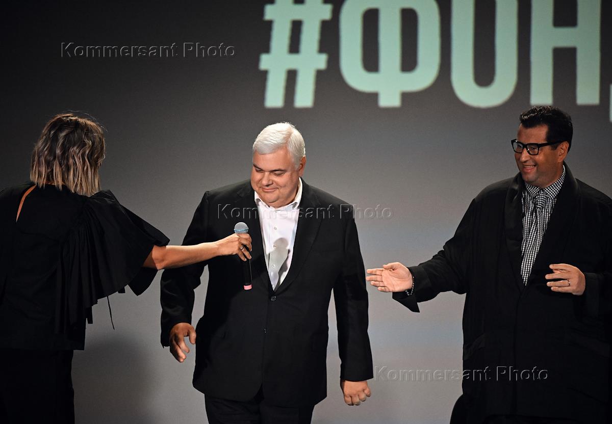 The fifth ceremony of presenting the annual award in the field of intellectual volunteering ProCharity at the Rassvet cultural center. From right to left: entrepreneur and co-founder of the Friends Charitable Foundation (CF) Yan Yanovsky, head of Mastercard in Russia, Kazakhstan, Belarus and Armenia, board member of the Friends Charitable Foundation Alexey Malinovsky and manager of the Friends Charitable Foundation Maria Balandina during the ceremony.