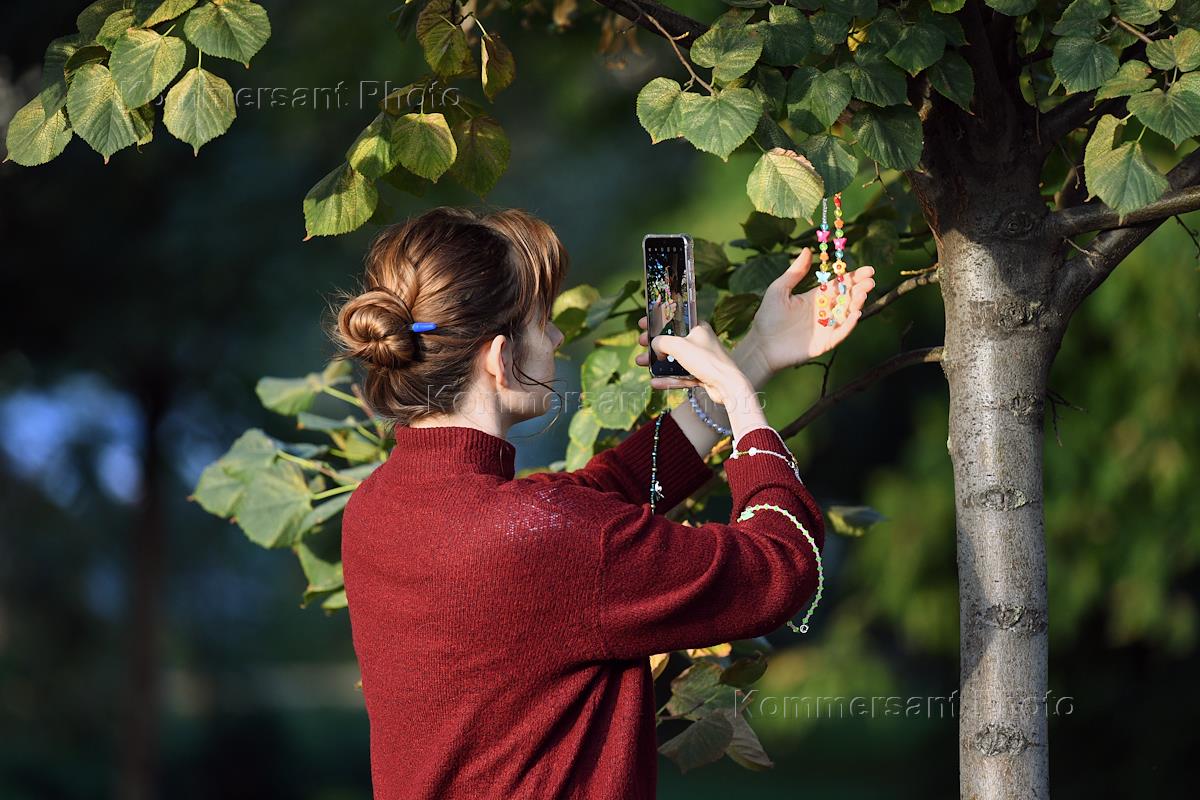 Views of Moscow. Genre photography. Vacationers on the Crimean embankment. Woman with a mobile phone.