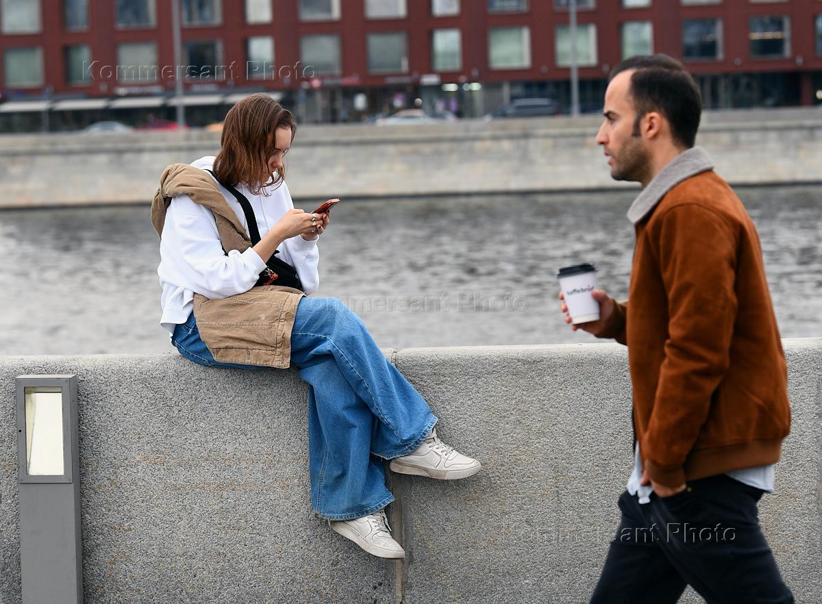 Views of Moscow. Crimean embankment. Genre photography. A girl with a mobile phone sits on the parapet of the embankment.