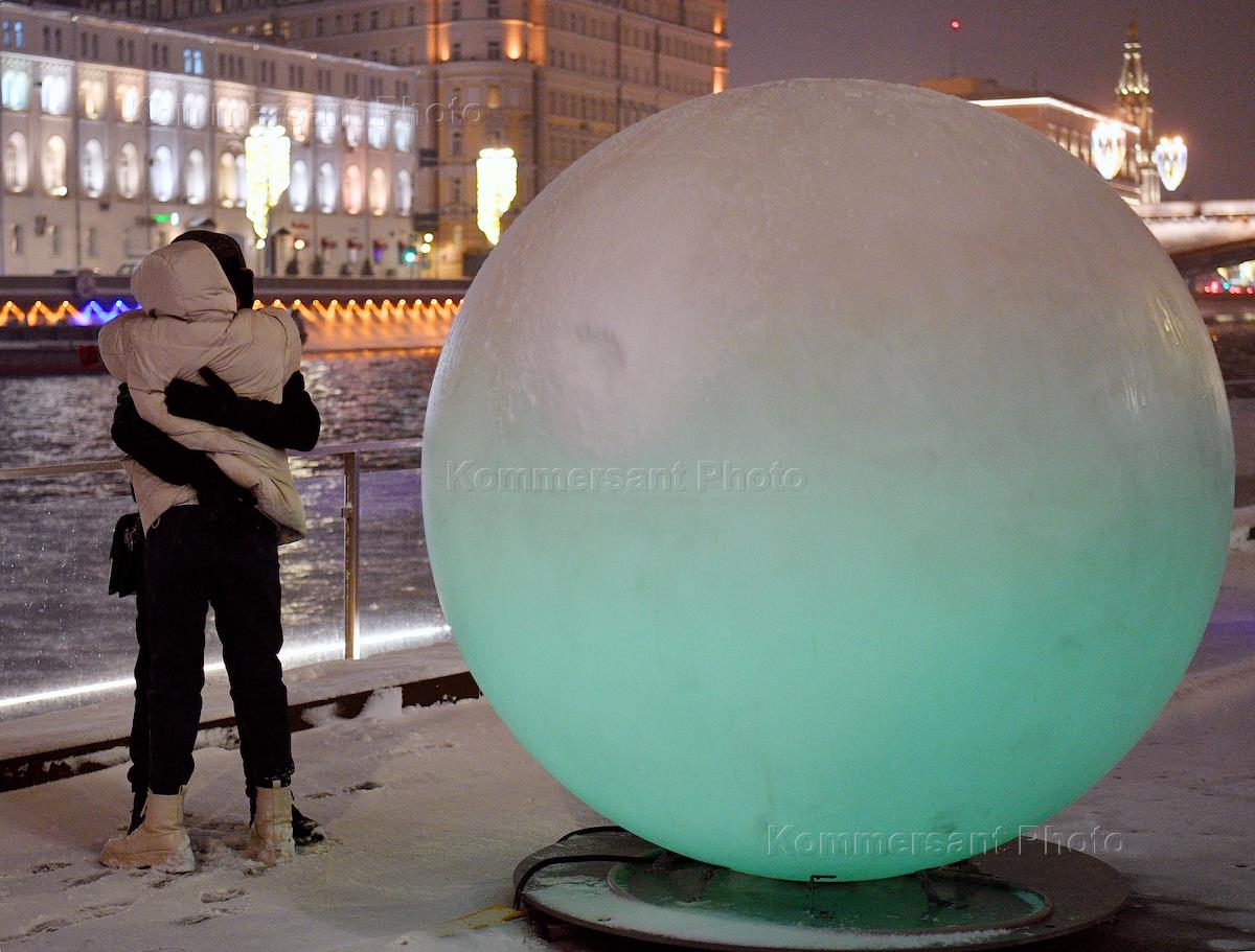 Genre photography. A couple of young people hug on Moskvoretskaya embankment near a luminous ball.