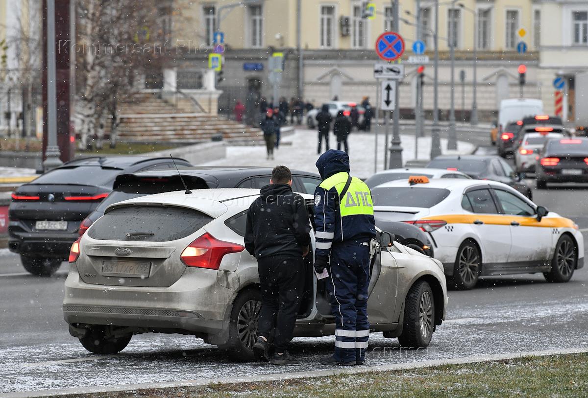 Views of evening Moscow. Genre photography. A traffic police officer on Mokhovaya Street.