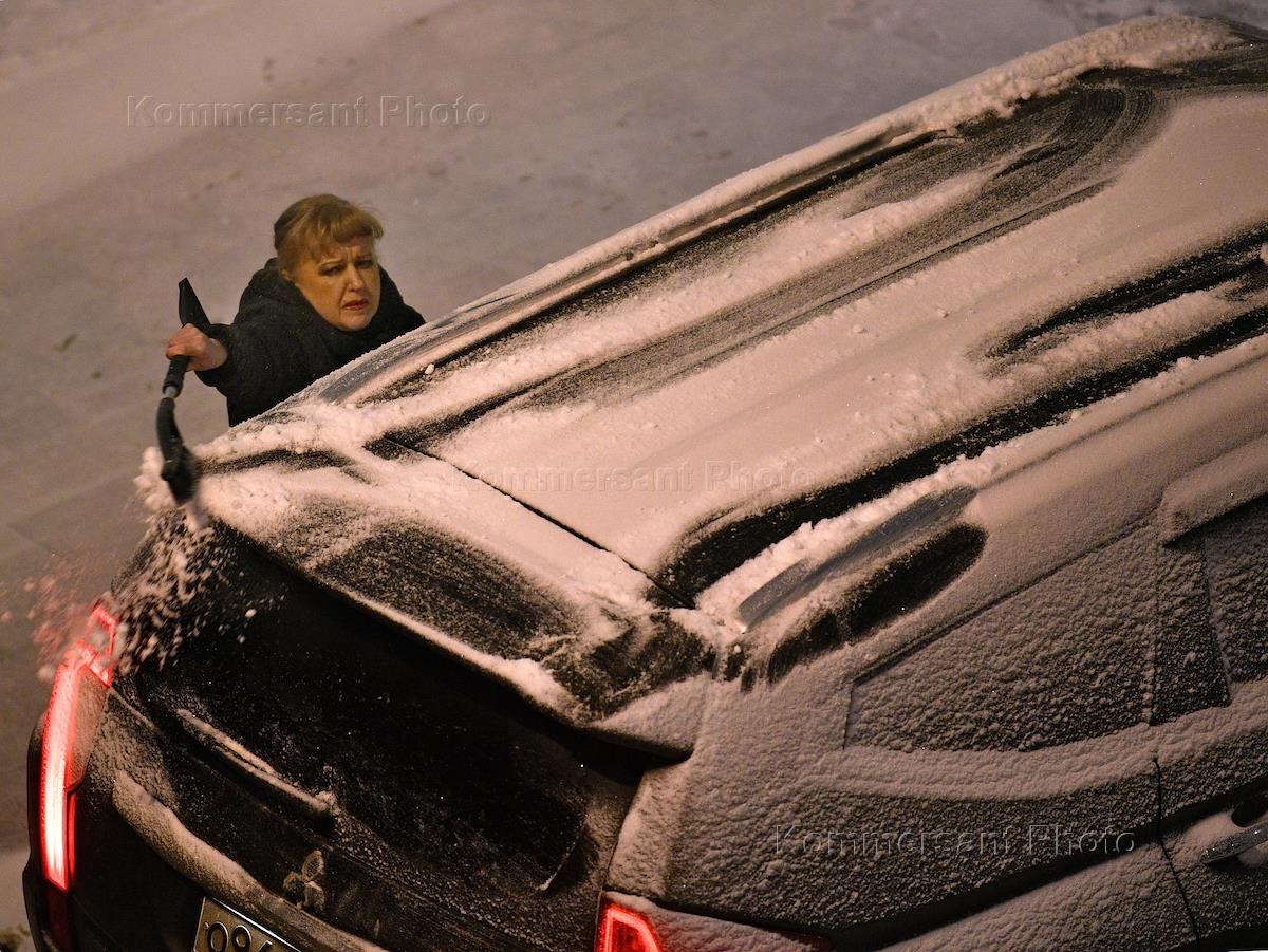 Views of Moscow after a snowfall. Genre photography. A woman gets out of a taxi car.