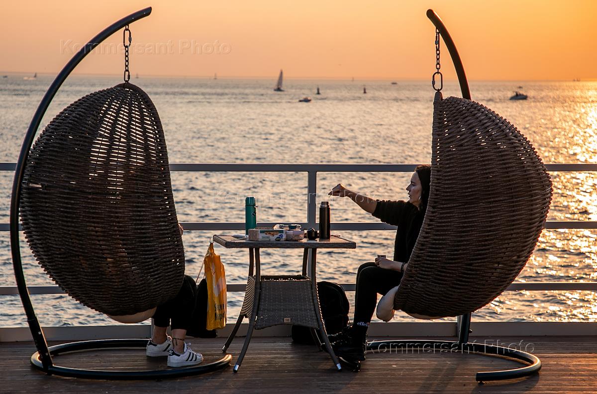 Виды Санкт-Петербурга. Жанровая фотография. Отдыхающие на общественном пространстве "Флагшток" на берегу Финского залива.
