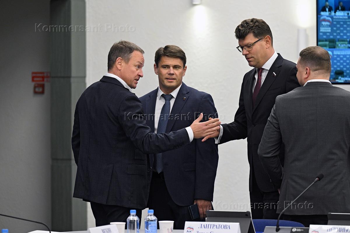 A joint meeting of the Bureau of the Supreme Council and the General Council of the United Russia party, dedicated to the results of the Single Voting Day 2023 in the Central Executive Committee of the party. From left to right: deputy head of the United Russia faction in the State Duma (State Duma) of Russia, first deputy chairman of the Russian State Duma Committee on Youth Policy Igor Kastyukevich, head of the Central Executive Committee of the United Russia party, deputy secretary of the general council of the party Alexander Sidyakin, first deputy Chairman of the Russian State Duma (State Duma) Committee on Information Policy, Information Technologies and Communications Sergei Boyarsky, First Deputy Chairman of the Russian State Duma Committee on Economic Policy Denis Kravchenko and before the start of the meeting.