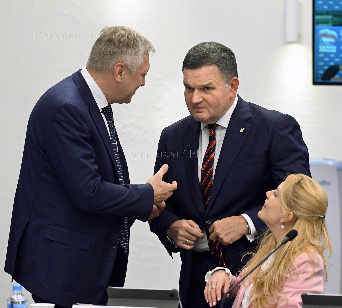 Совместное заседание Бюро высшего совета и Генерального совета партии "Единая Россия", посвященное итогам Единого дня голосования-2023 в Центральном исполкоме партии. Слева направо: заместитель руководителя фракции "Единая Россия" в Государственной думе (ГД) России, первый заместитель председателя комитета ГД России по молодежной политике Игорь Кастюкевич, первый заместитель председателя комитета ГД России по молодежной политике Алена Аршинова Алена и представитель в Совете Федерации России от исполнительного органа государственной власти Ленинградской области Сергей Перминов перед началом заседания.