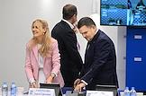 Совместное заседание Бюро высшего совета и Генерального совета партии "Единая Россия", посвященное итогам Единого дня голосования-2023 в Центральном исполкоме партии. Gредставитель в СФ России от исполнительного органа государственной власти Луганской Народной Республики Дарья Лантратова (слева) и представитель в Совете Федерации (СФ) России от исполнительного органа государственной власти Ленинградской области Сергей Перминов (справа) перед началом заседания.