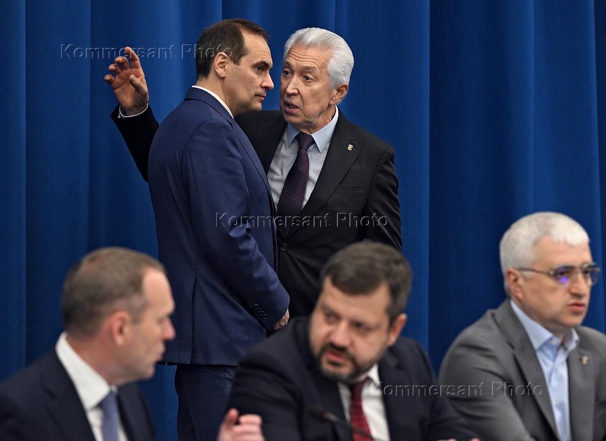 A joint meeting of the Bureau of the Supreme Council and the General Council of the United Russia party, dedicated to the results of the Single Voting Day 2023 in the Central Executive Committee of the party. The head of the United Russia faction in the State Duma of Russia Vladimir Vasilyev (center left) and the head of the Central Executive Committee of the United Russia party, deputy secretary of the party's general council Alexander Sidyakin (center right) before the start of the meeting.