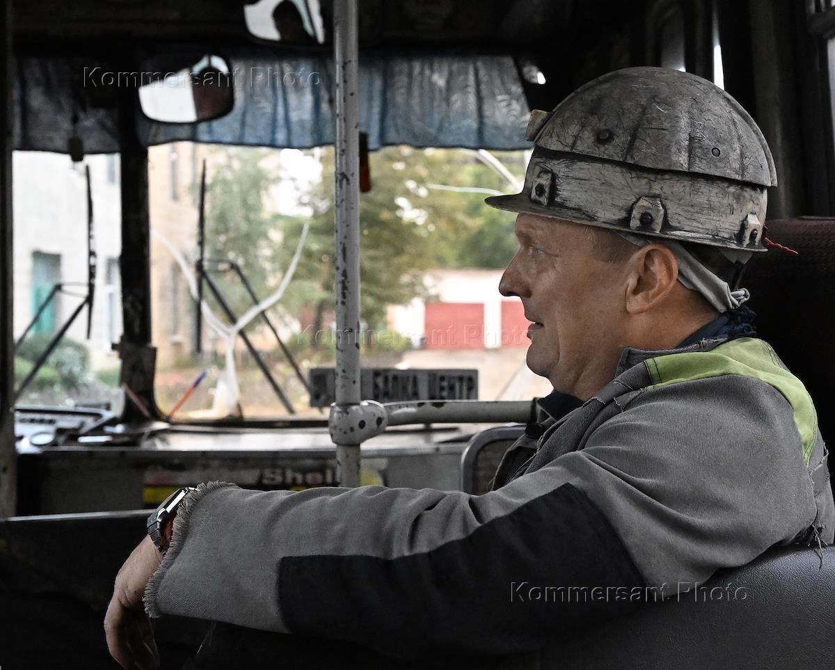 Ситуация в Донецкой Народной Республике (ДНР). Работа угольной шахты "Холодная Балка" Государственного унитарного предприятия ДНР "Макеевуголь". Жанровая фотография. Шахтер едет в автобусе.