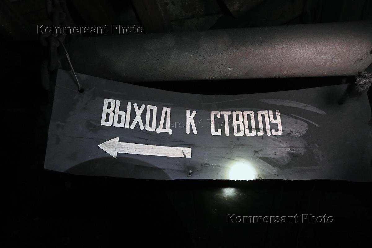 The situation in the Donetsk People's Republic (DPR). Work of the Kholodnaya Balka coal mine of the State Unitary Enterprise of the DPR "Makeevugol". Genre photography. Signpost "Exit to the shaft."