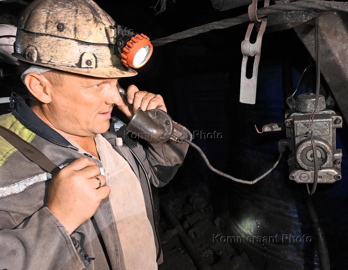 The situation in the Donetsk People's Republic (DPR). Work of the Kholodnaya Balka coal mine of the State Unitary Enterprise of the DPR "Makeevugol". Miner during coal mining.