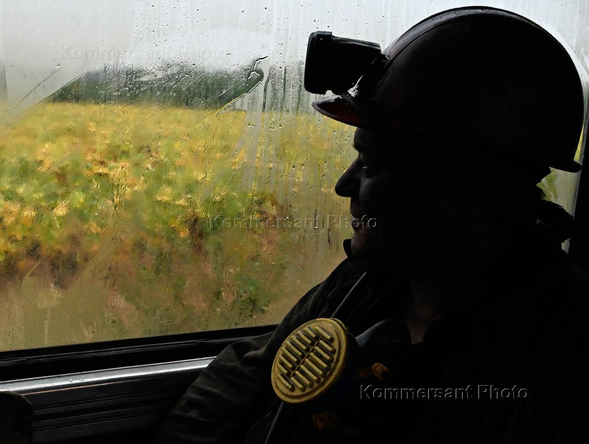 The situation in the Donetsk People's Republic (DPR). Work of the Kholodnaya Balka coal mine of the State Unitary Enterprise of the DPR "Makeevugol". Genre photography. A miner is traveling on a bus.