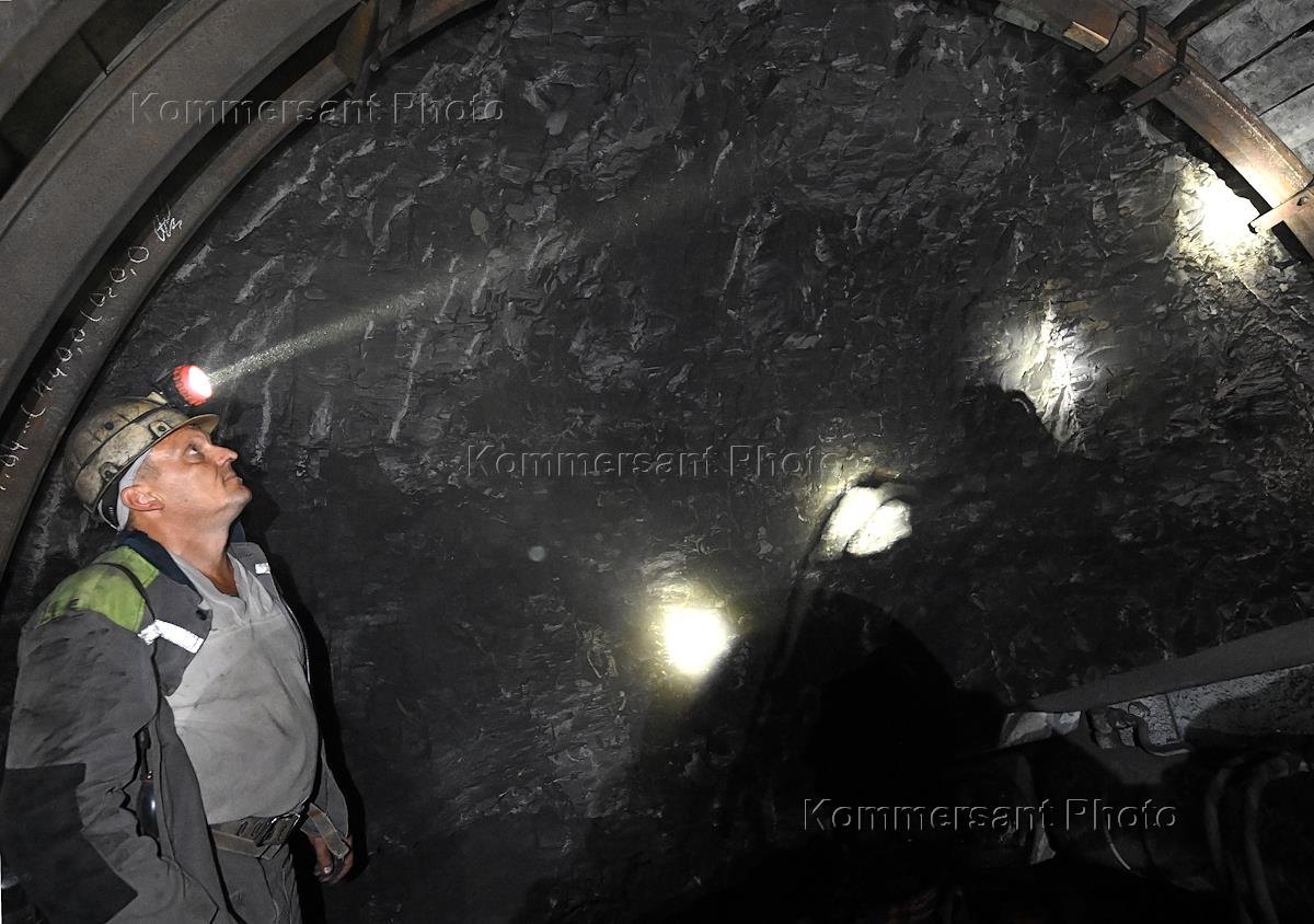 The situation in the Donetsk People's Republic (DPR). Work of the Kholodnaya Balka coal mine of the State Unitary Enterprise of the DPR "Makeevugol". Miner during coal mining.